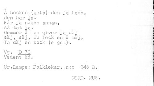 //// ° f \ 7 A bocken (geta) den ja hade, //// den har ja. //// Far ja någon annan, //// så tat ja. i //// Gemmer å lan giver jaodäj i //// säj, säj, du feck en å maj, [ //// Ta däj en bock (e get) . f //// i //// Vg. D 70 i //// Vedens hd. [ //// l ¦ //// ! //// Ur.Lampa: Folklekar, n:o 346 B. //// NORD. MUS. ////