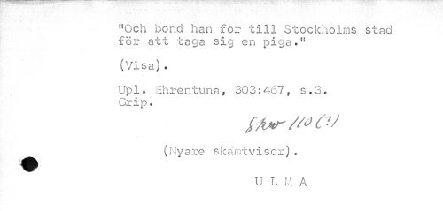 //// "Och bond han for till Stockholms stad för att taga sig en piga." //// / //// (Visa). //// Upl. Ehrentuna, 303:467, s.3. Grip. //// (Nyare skämtvisor). //// U L M A ////