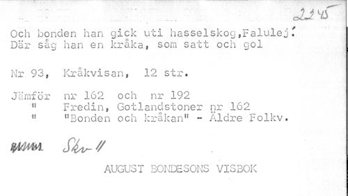 //// :. : ¦' ¦ ' " JJK //// A //// Och bonden han gick uti hasselskog,Falulej. Där såg han en kråka, som satt och gol //// Nr 93, Kråkvisan, 12 str. //// Jämför nr 162 och nr 192 //// n Fredin, Gotlandstoner nr 162 " "Bonden och kråkan" - Äldre Folkv. //// hmwl // //// AUGUST BONDESONS VISBOK ////