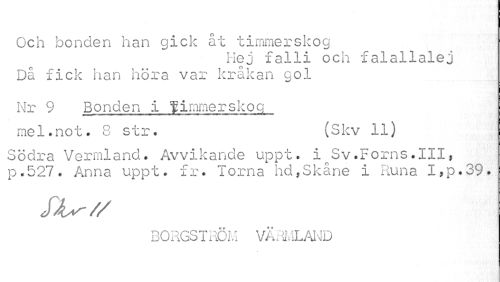 //// Och bonden han gick åt timmerskog //// Hej falli och falallalej Då fick han höra var kråkan gol //// Nr 9 Bonden i fi rnme r s k og //// , • ••-.. . • - • ..-i. -¦•i— • ar- -. ¦-¦¦¦ --1 - . r ¦ -r • - -' " - -•... ¦-i -c-:'."-» -» //// mel.not. 8 str. (Slev 11) //// Södra Vermland. Avvikande uppt. i^Sv.Forns.III, p.527. Anna uppt. fr. Torna hd,Skåne i Runa I,p•39. //// fJU-// //// BORGSTRÖM VÄRMLAND ////
