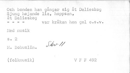 //// Och bonden han gångar sig åt Dalieskog-Sjung hejande lia, hoppsan, åt Dalieskog //// - - - - var kråkan hon gol o.s.v. //// Med musik s * 2 //// N. Bohuslän. : * ^ (folkmusik) V F F 492 ////