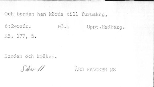 //// Och bonden han körde till furuskog, //// 6:2+refr. PQ.; Uppt .Hedberg. //// R5, 177, 5. //// Bonden och kråkan. //// S*tr// ÅBO RANCKEN MS ////