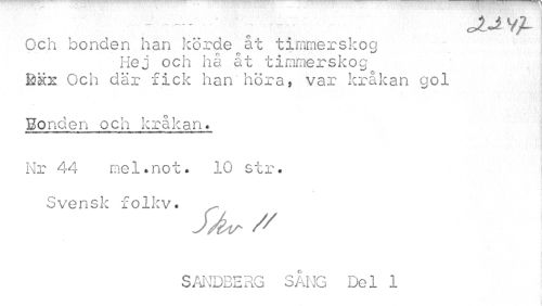 //// - - o jLJ^yj- //// Och bonden han körde åt timmerskog //// Hej och ha åt timmerskog Bär Och där fick han höra, var kråkan gol //// - •j //// Bonden och kråkan* //// Nr 44 mel.not. 10 str. Svensk folkv. //// fAv/' //// SANDBERG SANG Del 1 //// ¦I ////