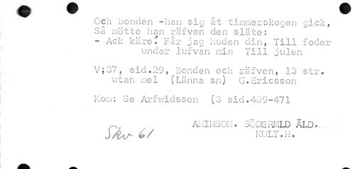 //// BI Br Hr //// ml ^^^F ^^^ //// Och. bonden -han sig åt timmerskogen cick. Sa mötte han räfven den släte: - Ack käre T Far jag huden din, Till foder //// under lufvan min Till julen //// V; 37, sid.29, Bonden och räfven, 13 str. utan mel (Länna sn) G.Ericsson //// Kom; Se Arfwidsson (3 sid.469-471 //// 0 AMINSON. SÖDE RMLD ÄLD.,; . V //// J/étA KULT.H. ////