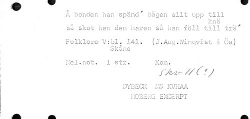 //// A bonden han spänd * bågen allt upp till //// k n ä //// så skot han den haren så han föll till trä' //// Folklore V:bl. 141. (J.Aug .Winqvist i Ös) //// Skåne //// Lie 1.no t • 1 str. Kom. //// DYBECK MS KVKAA MOBERG EXCERPT ////