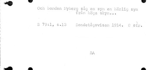 //// Och bonden Nyberg sag en syn en härlig syn //// från höga skyn... //// .v //// Q * //// B 79:1, s.13 Bondetagsvisan 1914. 8 str. //// t. //// RA //// . 4 ////