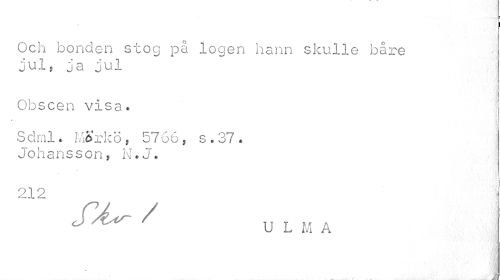 //// i //// Och bonden stog på logen hann skulle båre jul, ja jul //// ? i //// ,V ' 1 //// Obscen visa. //// * //// Sdml. Marko, 5766, s.37 « Johansson, N.J. //// i //// 212 //// J / U L M A //// i ////