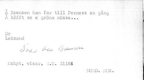 //// O / //// A Bremsen han for till Permess en gång //// A köfft se e gröna mosse... //// ¦ //// : //// Dr //// Leksand //// Mskpt, visor, i.U. 31184 //// ' NORD. MUS. ////