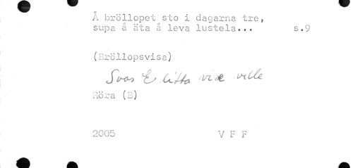 //// A bröllopet sto i dagarna tre, //// supa å äta å leva lustela... s.9 //// (Bröllopsvisa) //// xJti* ^ //// Röra (B) //// 2005 V F F ////