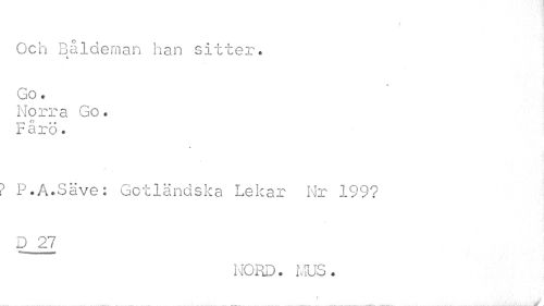 //// Och Baldeman han sitter. Go. //// Norra Go. //// f, //// * • * //// i- a ro. //// P.A.Säve: Gotländska Lekar Nr 199? p 27 //// NORD. MUS. //// i ////
