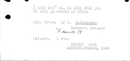 //// A bäll int' du, så bäll föll jä, Så bäll ja svinka mä kö11o //// Sid . 33-34. Nr 1 * Kulldansen* //// < LeksancL Dalarna //// A t&vur&l /y //// Mel.not. 1 str. //// DYBECK RUNA AINTIQV.TIDSKRi 1845 ////