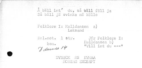 //// ¦ //// yjy, ' . ' • '' •_r* jr' "f- * t '' p t f.. \ ' • /^S ' . //// A bäll int' du, så foäll föll ja Så bäll jä svinka mä köllo //// Folklore I: Kulldansen a) //// Leksand //// IAel.not. 1 str. Jfr Folklore I: //// i Kulldansen b) //// /z* "Vill int du — « //// 'T //// DYBECK m KVHAA JO BERG EXCERPT ////