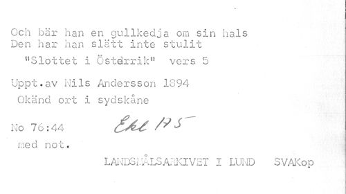 //// Och bär han en gullkedja om sin hals Den har han slätt inte stulit //// "Slottet i Östérrik" vers 5 //// Uppt.av Nils Andersson 1894 Okänd ort i sydskåne //// No 76:44 med not. //// LAI'JD3i.ÅLSATliCIV2T I LUND SVAKop ////