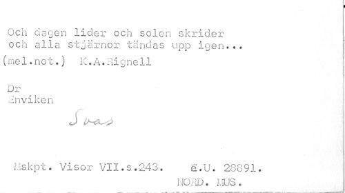 //// Och dagen lider och solen skrider och alla stjärnor tändas upp igen... //// (mel.not.) K.A.Rignell Dr //// inviken //// J U-t5L<2 //// Mskpt. Visor VII.s.243. e.U. 28891. //// i JO. ID. MUS . ////