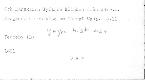 //// ¦ //// Och Danskarna lyftade klinkan från dörr... Fragment ur en visa om Gustaf Vasa. s.ll //// Tegneby (B) " 1481 //// V F F //// ___.. . > i ^r-, ... . . . «. ////