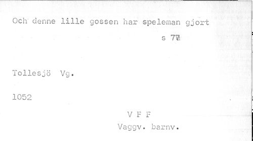 //// Och denne lille gossen har speleman gjort //// s 7% '' //// Tollesjö Vg. //// 1052 . : //// V F F Vaggv. barnv. ////