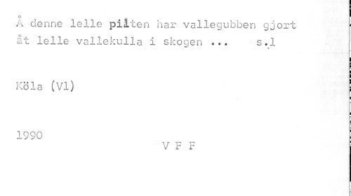 //// A denne lelle pilten har vallegubben gjort //// jTV //// åt lelle vallekulla i skogen ... s.l //// Köla (VI) ! //// I //// 1990 ' //// V F F ////