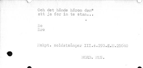 //// Och det hände härom danfl att ja for in te stan... //// Bo //// Bro //// v //// ? //// / //// Mskpt. soldatsånger III.s.293.E.U.25040 //// NORD. I,IUS. //// « ////