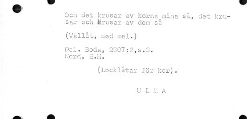 //// ^ Och clet krusar av korna mina så, det kru- //// sar och krusar av dem så //// (Vallåt, med mel.) //// Dal. Boda, 2807:2,s.3. //// T T 1 T T //// hora, £.h. //// (Locklåtar för kor). //// v //// U L M A ////