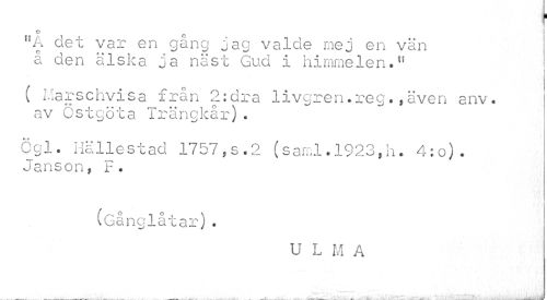 //// f //// o c //// ftA det var en gäng jag valde mej en vän å den älska ja näst Gud i himmelen." //// I i //// /c i //// ( Marschvisa fran 2:dra livgren.reg.,även anv. av Östgöta Trängkår)« //// Cgl. Hällestad 1757,s.2 (saml.1923,h. 4:o). Janson, F. //// (Gånglåtar). //// U L M A //// __ t ... ... ...___JI_iij__. _u_. j^mtm», ... ^ . j.. '.it£äk:.:. : -^MMM^"jja^wftll^^ - JUamSmi iliutttäm ////