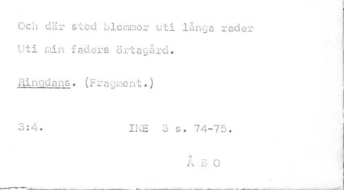 //// Och där stod blommor uti långa rader Uti min faders örtagård. //// Ringd arvs . (Fragment.) //// j //// 3:4. I NE 3 s. 74-75. //// ÅBO ////
