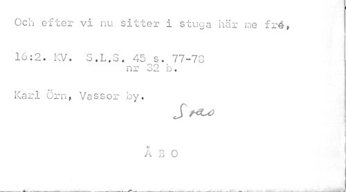 //// Och efter vi nu sitter i stuga här me fré, //// 16:2. KV. S.L.S. 45 s. 77-73 //// nr 32 h. //// Karl örn, Vassor by. //// S //// ÅBO ////