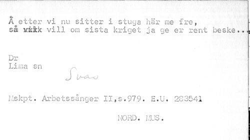 //// €b //// A etter vi nu sitter i stuga här me fre, //// så xcifc&k vill om sista kriget ja ge er rent beske...: //// Dr ' ! Lima sn //// Mskpt. Arbetssånger II,s.979. E.U. 283541 //// NORD. MUS. ////