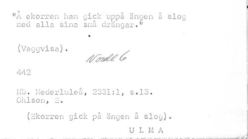 //// o G O //// "A ekorren han gick uppa ängen a slog //// med alla sina små drängar *u //// % //// (Vaggvisa)* 442 //// Nb. Nederluleå> 2331:1, s.13. //// Ohlson» E. //// (Ekorren gick på ängen å slog). //// U L M A //// . , ¦ . _ . . A . ^^JAL AM.-k ////
