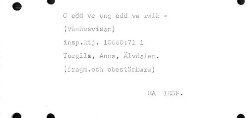 //// O edd ve ung edd ve raik - //// (Våmhusvisan) //// insp.Rtj. 10660:71 I Torgils, Anna, Älvdalen, (fragm.och obestämbara) //// RA IMSP. //// y ////