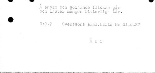 //// o //// A ensam och sörjande flickan går och ljuter mången bitterlig- tår. //// 3:8.? Svenssons saml.häfte Nr 31.S.87 //// Å B O //// / //// / ////