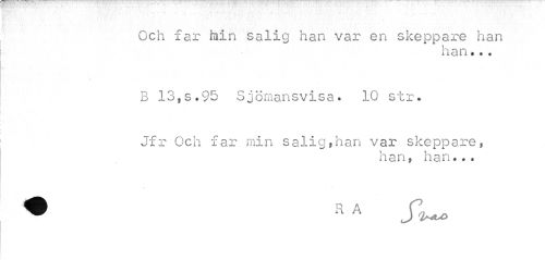 //// Och far bin salig nan var en skeppare han //// han... //// B 13fs.95 Sjömansvisa. 10 str» //// Jfr Och far min salig,han var skeppare, //// han, han... //// • R A J"U> ////