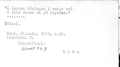 //// o i //// nA femton käringar^i varje vrå 1 //// å alla dansa di på krycker." //// tiv i s a) . //// Sdml. St.Malm, 4884, s.35. Palmblad, W. //// (Danslåtar). //// /l/^u f O 9 //// ' U L M A ////