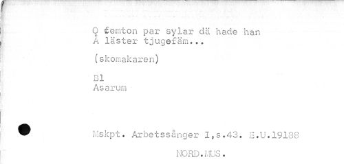 //// iff. I //// ¦ ¦ - - . v - ... //// O femton par sylar dä hade han A läster tjugefäm... //// (skomakaren) Bl //// Asarum //// ^ Mskpt. Arbetssånger I,s.43. E.U.19138 //// MORD. KfuS« ////