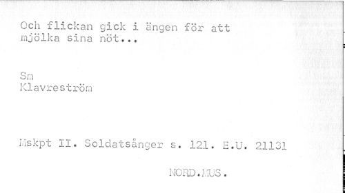 //// Och flickan gick i ängen för att mjölka sina nöt... //// ¦ ¦ //// Sm //// Klavreströrn //// Mskpt II. Soldatsånger s. 121. E.U. 21131 //// NORD.MUS. ////