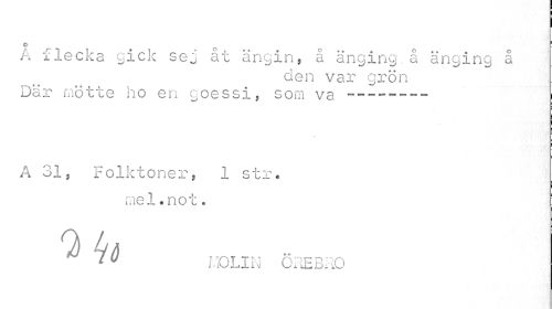 //// i //// c ; //// A flecka gick sej åt ängin, å änging.å änging å //// den var grön //// Där mötte ho en goessi, som va ---i //// A 315 Folktoner, 1 str. //// mel.not. //// 1 u I.DLIN OPJEBRO ////