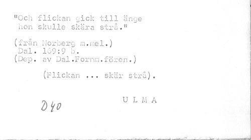 //// "Och flickan gick till ange hon skulle skära strå." //// (från Norberg ra.me1.) Dal. 169:9 b. //// (Dep. av Dal•Fornm.fören.) //// (Flickan .*. skär strå). //// ov , U L M A //// 1 //// > . r .. * i .a. .---^ ////