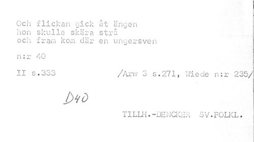 //// Och flickan gick åt ängen //// hon skulle skära strå //// och fram kom där en ungersven //// n: r 40 //// II s . 333 /Arw 3 s.271, Wiede n:r 235/ //// i>td //// TILLH.-DENCKHR SV.FOLKL. ////