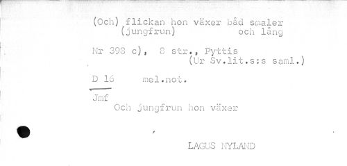 //// (Och) flickan hon växer båd småler //// (jungfrun) och lång //// Nr 393 c), C str., Pyttis //// (lir Sv.lit.s:s saml.) //// & //// D 16 mel.not. Jmf //// Och jungfrun hon växer //// LAGUS NYLAND ////