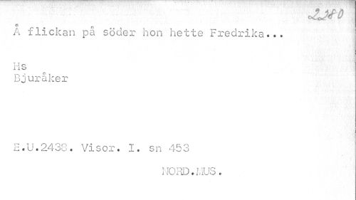 //// oZJfö //// r //// A flickan pa söder hon hette Fredrika... Hs //// Bjuråker //// E.U.2438. Visor. I. sn 453 //// NORD.MUS. ////