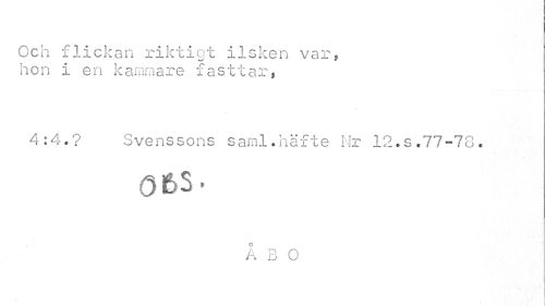 //// Och flickan riktigt ilsken var, hon i en kammare fasttar, //// 4:4.? Svenssons saml.häfte Nr 12.s.77-78. //// • j] //// ÅBO ////