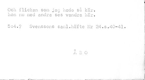 //// Och flickan som jag hade så kär. hon nu med andra ses vandra här. //// 5:4.? Svenssons saml.häfte Kr 24.s.40-41. //// A B u ////