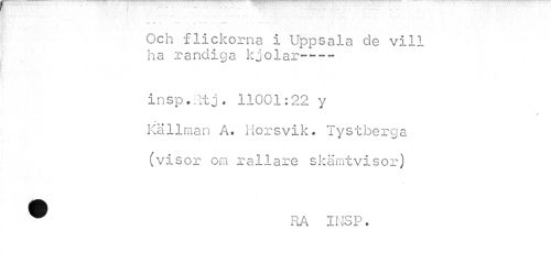 //// i //// ¦ //// Och flickorna I Uppsala de vill ha randiga kjolar— — //// insp.Rtj. 11001:22 y //// y //// Källman A. Horsvik. Tystberga (visor om rallare skämtvisor) //// ® RA INSP. ////