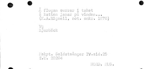 //// wm //// ^^ © //// A flugan surrar i taket a katten jamar på vinden... (K.A.Rignell, not. omkr. 1870) //// Vg //// Bjurback //// Mskpt. Soldatsånger IV•sid.25 E.U. 28204 //// I JORD. MUS. ////