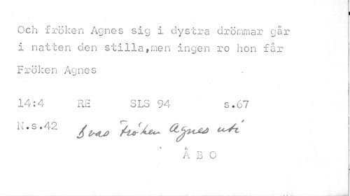 //// I //// Och fröken Agnes sig i dystra drömmar går i natten den stilla,men ingen ro hon får //// Fröken Agnes //// 14:4 RE SLS 94 s.67 //// N*S'42 u^v' //// o //// A B O ; ////