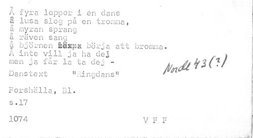 //// v //// o //// A fyra loppor i en dans a lusa slog på en tromma, å myran sprang å räven sang //// å björnen ftäsps börja att bro mm a * A inte vill ja ha del i //// men ja får la ta dej - £/ f J (•/ //// Danstext "Ringdans11 ' //// Forshälla? Bl* s. 17 //// 1074 V F F //// .i , -r-i - ; . > . .i - - ~ ---iéMÉH //// . A- ¦ - - - - -«** .» J . .„ __/__.. — J-i..»-v * -r - ~ . ////