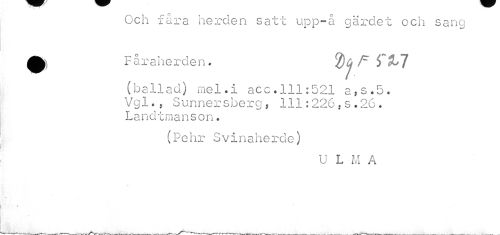 //// Och fåra herden satt upp~å gärdet och sang //// Fåraherden. uCjF^lhl //// (ballad) mel.i acc.111:521 a,s.5. Vgl., Sunnersberg , 111;226 .s.26. Landtmanson. //// (Pehr Svinaherde) //// U l M A //// * ' ////