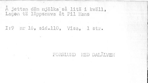 //// ° o //// A jettan däm mjölka^sa lita i kväll, Lagen tä läppsnuva åt Pil Hans //// 1:9 nr" 16, sid.110, Visa, 1 str. //// « //// FORS LUND i.ED DALÄLVEN ////