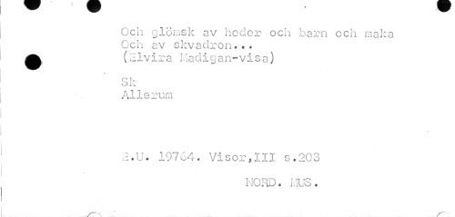 //// Och glömsk av heder och barn och maka Och av skvadron... ^ (Elvira Madigan-visa) //// Cl- //// o k //// Allerum //// 2.U. 19764. Visor,III s.203 //// NORD. MUS. ////