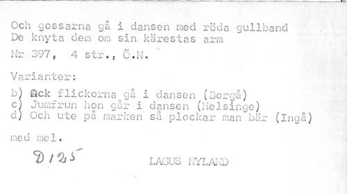 //// Och gossarna gå i dansen med röda gullband De knyta dem om sin kärestas arm //// Nr 397j 4 str., Ö.N. Varianter; //// b) Qck flickornaogå i dansen (Borgå) //// c) Jumfrun hon går i dansen (Helsinge) //// d) Och ute på marken så plockar man bär (inga) //// me d me 1 * //// D /*Qj i LAGUS NYLAND //// * ////