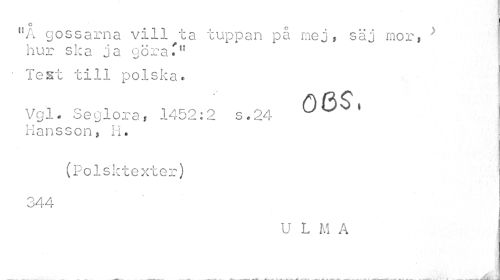 //// ° o v //// "A gossarna vill ta tuppan pa mej, säj mor, hur ska ja göra T" //// • Test till polska. //// Vgl* Seglora, 1452:2 s.24 U 1 Hansson, H. //// (Polsktexter) //// 344 //// U L M A //// * //// M ////